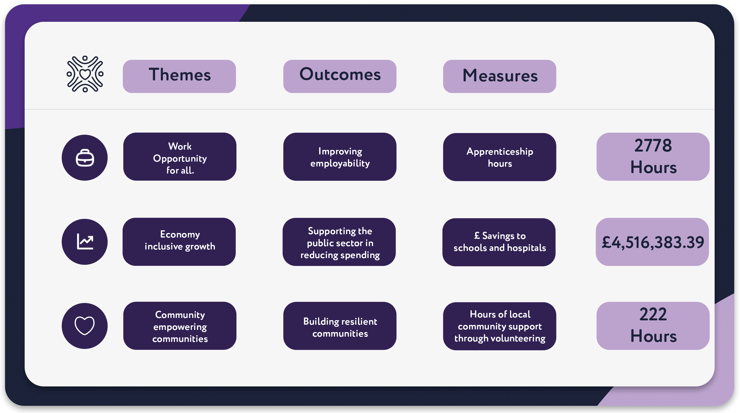 At Procurement Services we are proudly committed to delivering positive change and we measure our social value impact to understand the difference our people and solutions are making. See below for our contributions so far: